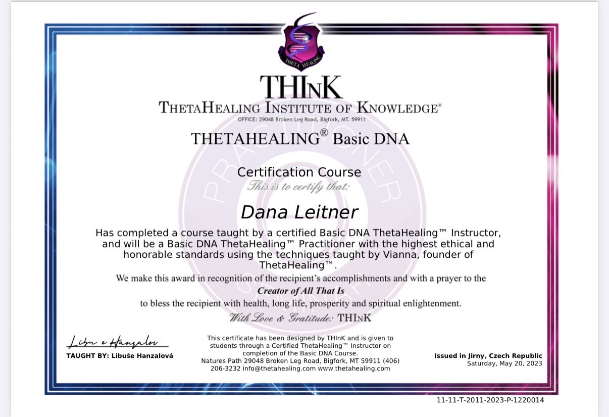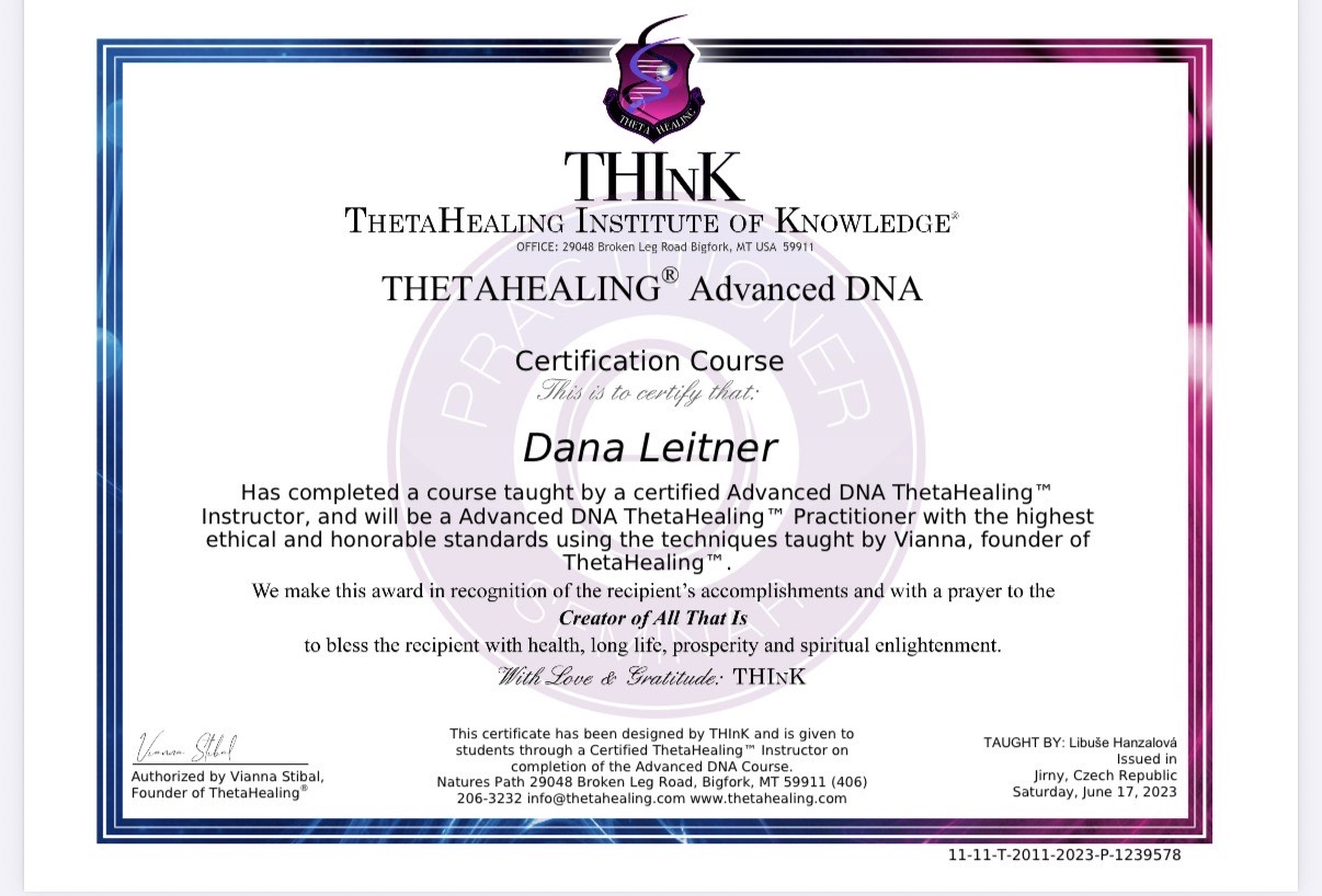 Níže najdete její certifikace v metodě Théta, které jsou součástí její dlouhodobé práce s lidmi.